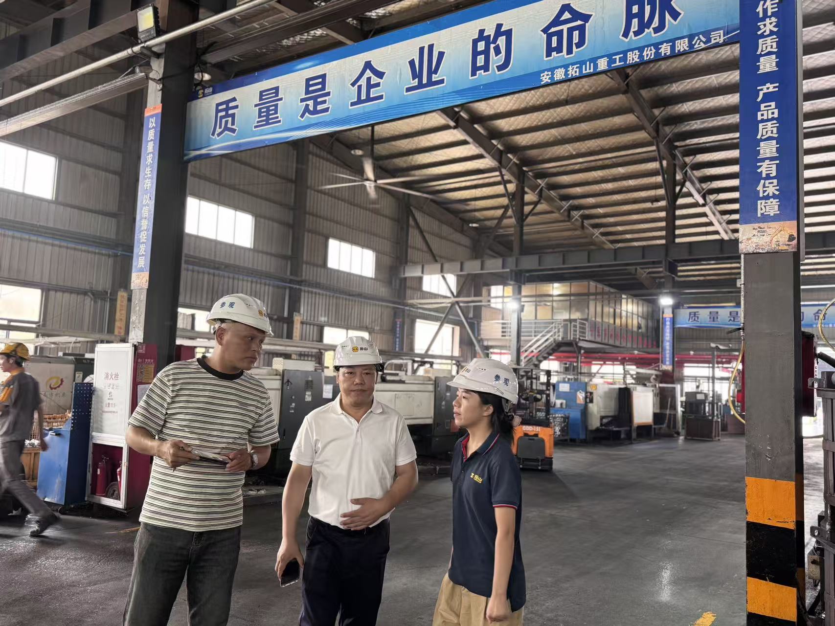 拓山重工的郭总和曾总则向两位老师详细介绍了公司的发展历程、企业文化以及未来的发展目标。公司自成立以来,通过了 ISO9001 质量管理体系认证,先后被评为安徽省高新技术企业、省级企业技术中心等,连续多年被当地政府授予明星企业等荣誉称号。公司还拥有员工 800 余人,下设有浙江拓山机械有限公司全资子公司,在技术研发与生产规模上具备显著优势。